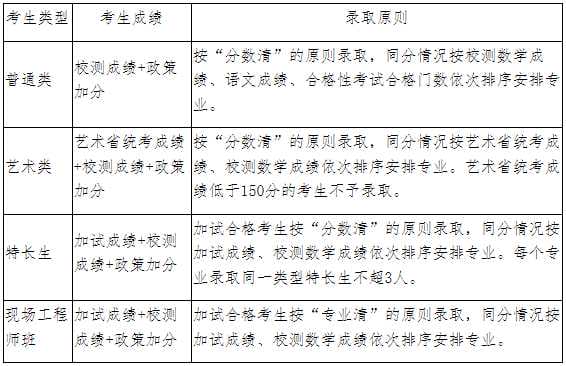 体育特长生、艺术特长生、现场工程师班考生,根据计划数和考生成绩,单独划线提前录取;未被以上项目录取的考生,根据其网上报名时的志愿信息按相应录取原则录取,并根据计划数和考生成绩划定相应考生类型的录取控制线。